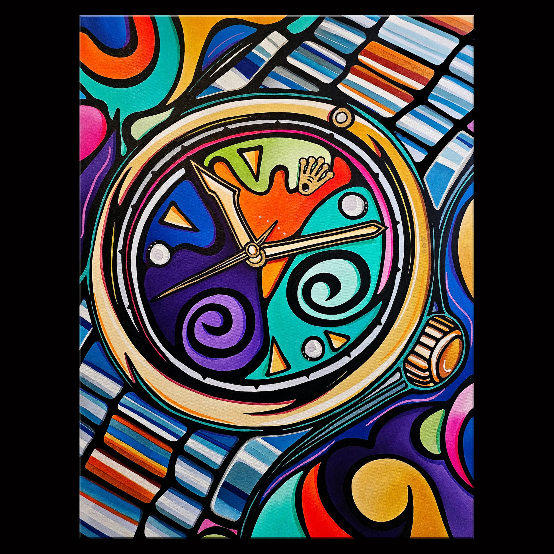 Expertly crafted, this colorful cubist collage watch painting combines the precision of a wristwatch with the creativity of abstract art. Featuring a vibrant color palette and a generous 30" x 40" size, this Swiss Made piece is a unique and eye-catching addition to any collection.