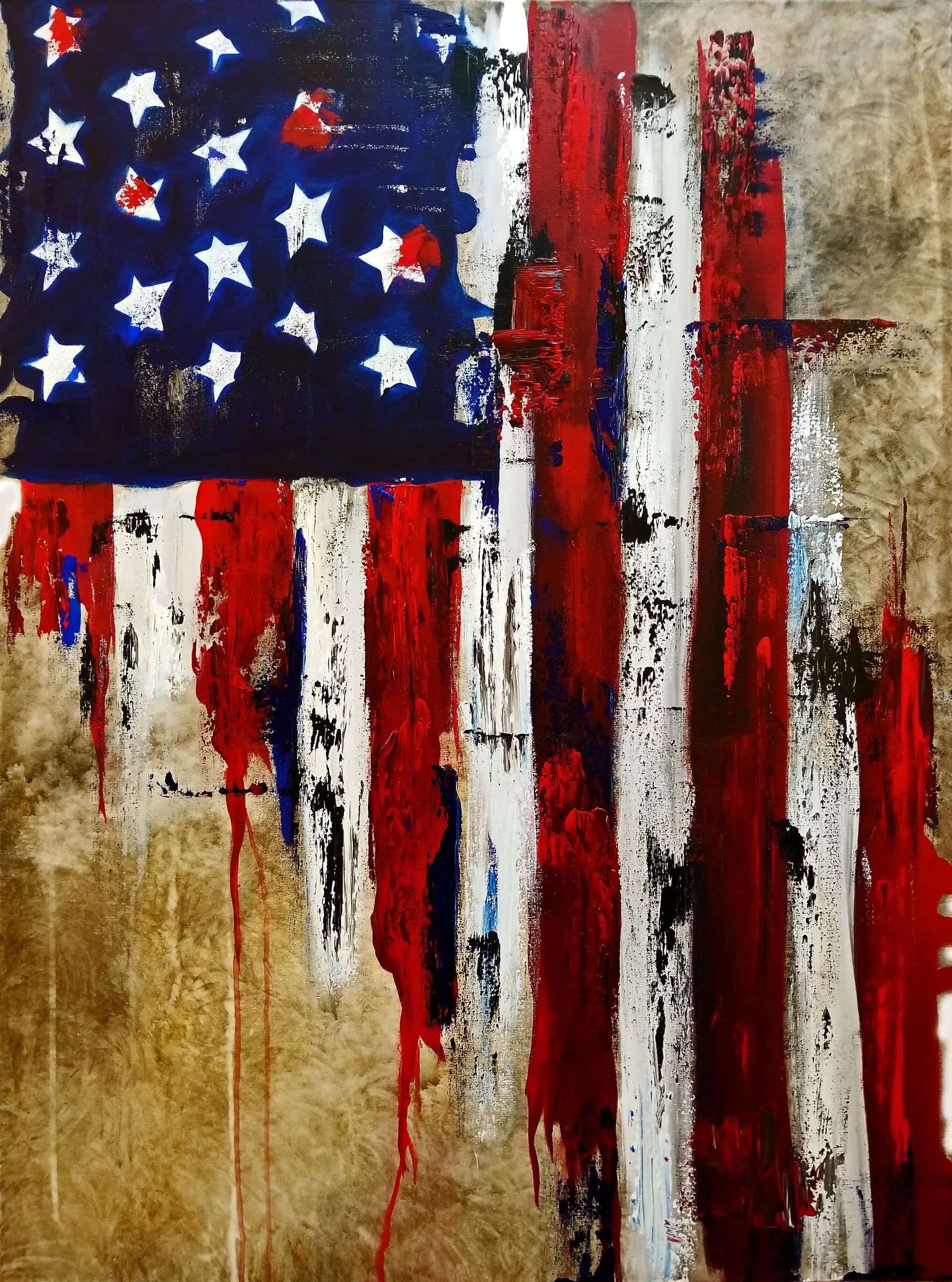 This Abstract Art Original Distressed Flag Painting is a 36" x 48" large masterpiece. The patriotic symbol captures the essence of America in a rustic, yet striking way. Perfect for any art lover looking to add a unique and meaningful piece to their collection.